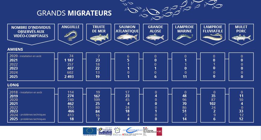 | Espèces | Anguille | Truite de mer | Saumon Atlantique | Grande alose | Lamproie marine | Lamproie Fluviatile | Mulet Porc | Total |