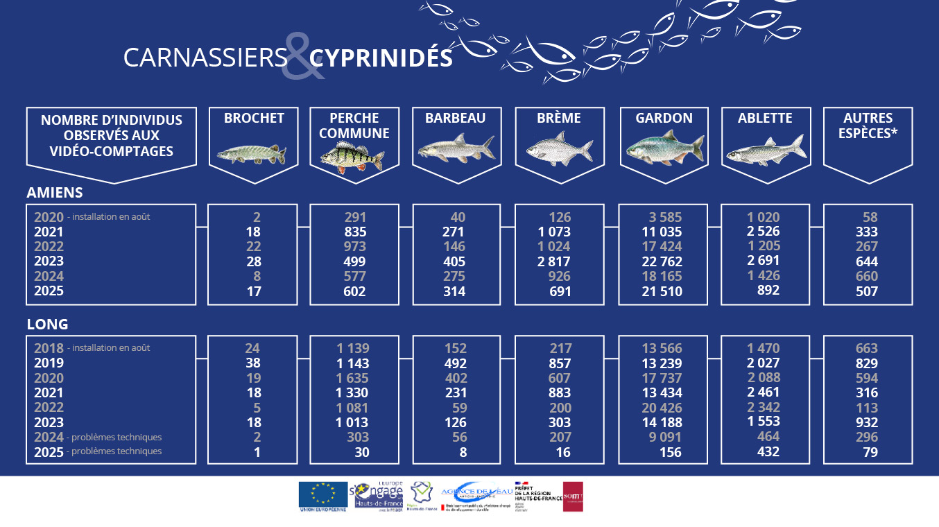 | Espèces | Brochet | Perche Commune | Barbeau | Brème | Gardon | Ablette | *Autres espèces | Total |